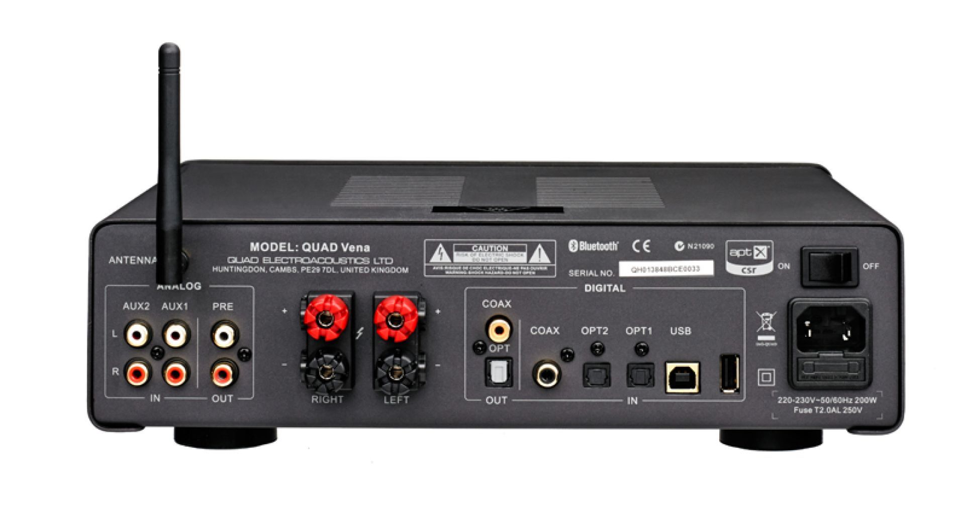Bluetooth V3.0 input with APTX (Antenna included) USB docking for 30P and lightning apple device Up to 192 kHz input for USB PC OPT IN x 2/pcs COAX IN x 1/pc Analogue input x 2/prs Headphone out x 1/pc Pre output x 1/pr OPT x 1/pc COAX x 1/pc 2 x 40W RMS@ 8 ohm THD = 1%, class AB amplifier; 2 x 56 W RMS (4Ω) Gain: 29 dB Input sensitivity: 600mV(RCA Line in) Input impedance: 10 kΩ (balanced) Frequency response: –0.8 dB (20Hz ÷ 20 kHz) Total harmonic distortion (THD): <0.1% (40 W, 1 kHz) Intermodulation distortion (IM): <0.05% (20 Hz ÷ 20 kHz) Signal to noise ratio (S/N): 100 dB (A Weighted, ref. 40 W)